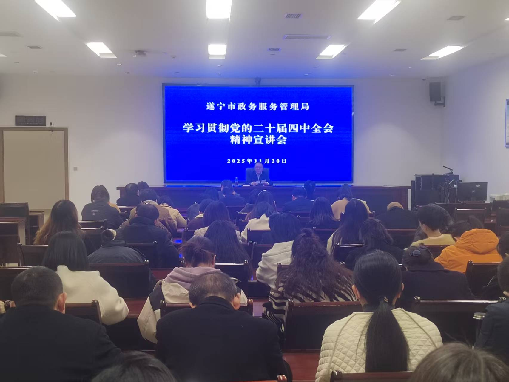 2025年11月20日,遂宁市政务服务管理局召开党的二十届四中全会精神专题宣讲会,专题学习贯彻党的二十届四中全会精神。局党组书记文林主持会议并作宣讲报告,市政务服务管理局、市政务服务和公共资源交易服务中心全体干部职工、市政务服务大厅窗口党支部全体党员参加会议。会议系统解读了全会精神核心要义,全面回顾总结遂宁市“十四五”时期经济社会发展辉煌成就,并结合当前实际对今后一个时期的政务服务工作进行系统部署。