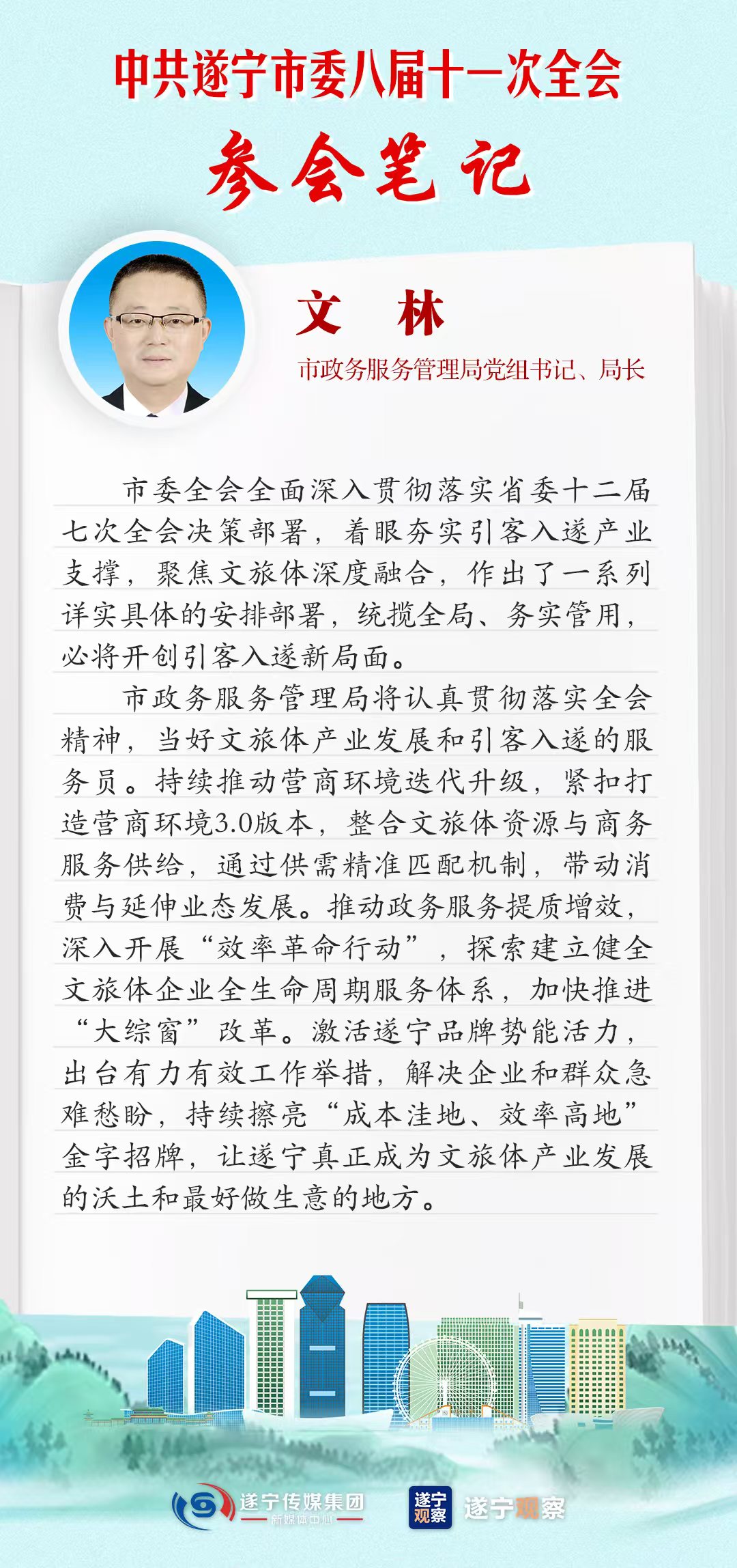 市政务服务管理局将认真贯彻落实全会精神,当好文旅体产业发展和引客入遂的服务员。持续推动营商环境迭代升级,紧扣打造营商环境3.0版本,整合文旅体资源与商务服务供给,通过供需精准匹配机制,带动消费与延伸业态发展。推动政务服务提质增效,深入开展“效率革命行动”,探索建立健全文旅体企业全生命周期服务体系,加快推进“大综窗”改革。激活遂宁品牌势能活力,出台有力有效工作举措,解决企业和群众急难愁盼,持续擦亮“成本洼地、效率高地”金字招牌,让遂宁真正成为文旅体产业发展的沃土和最好做生意的地方。