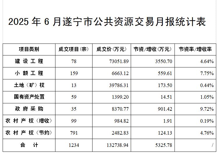 2025年6月,全市成交1234宗,成交金额132738.94万元,节资5135.84万元,增收189.92万元。